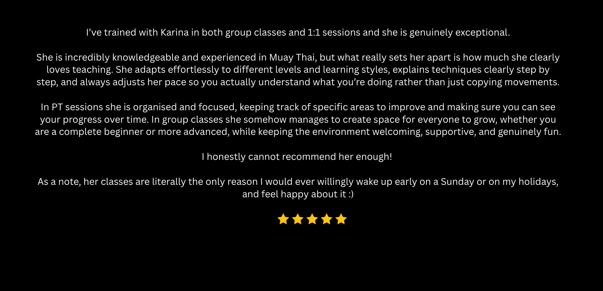 | 1-1 | For individuals who want high quality, personalised kickboxing training in a safe, inclusive environment — whether your goal is fitness, confidence, self-defence, or skill development. Suitable for all levels, including complete beginners. | £70 | 5 sessions- £325 ( £65 per session) |